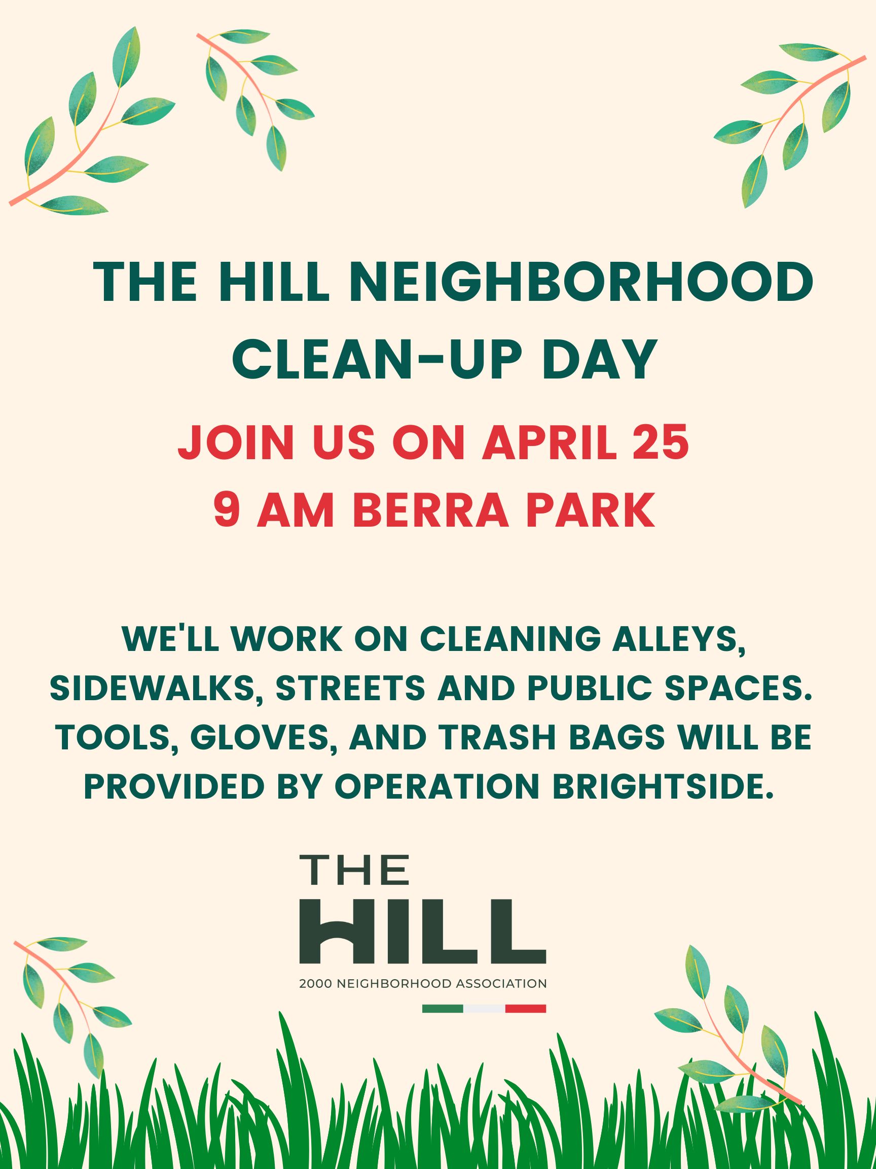 It’s back! Join us Saturday, April 25 for The Hill Neighborhood Clean-Up Day. We will meet at 9am in Berra Park. From there, volunteers will fan out into the neighborhood for a morning of service and beautification. Alleys, sidewalks, streets and public spaces will all be targeted. Tools, gloves, and trash bags will be provided by Operation Brightside. BBQ and refreshments provided directly after!