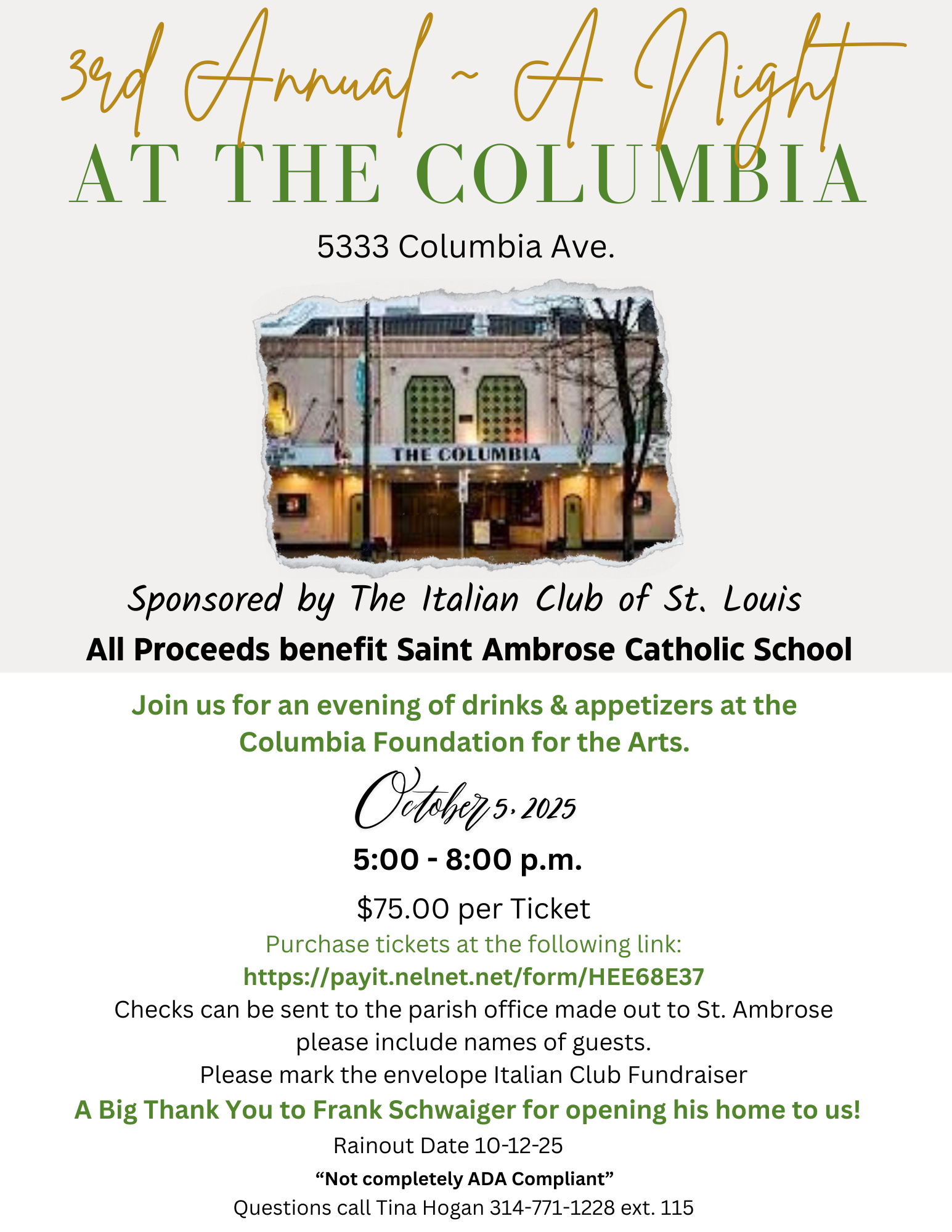 To pay by check: Send to the parish office, made out to St. Ambrose. Please include guest names and mark the envelope Italian Club Fundraiser.