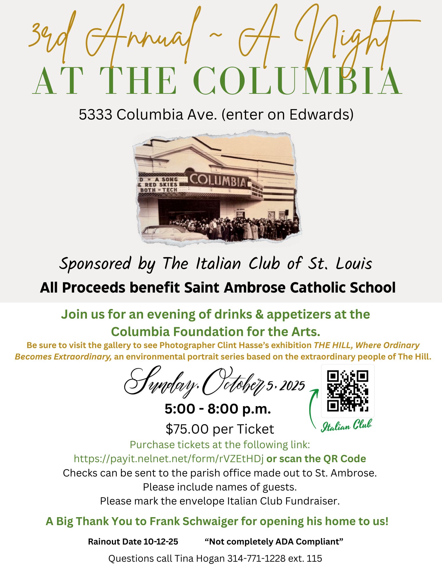 Join us for an evening of drinks and appetizers at the Columbia Foundation for the Arts, generously hosted by Frank Schwaiger. This special night supports the students of Saint Ambrose Catholic School and is presented by The Italian Club of St. Louis.